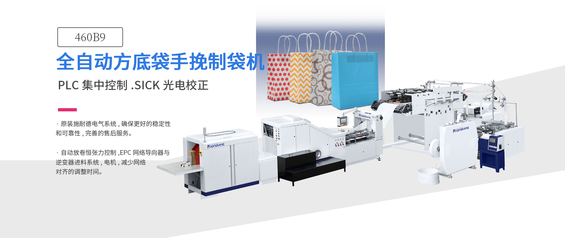 全自動手提紙袋機(jī)以其優(yōu)異的品質(zhì)和性能獲得了全世界用戶的認(rèn)可。本機(jī)用于生產(chǎn)帶手提把的方底紙袋,是由手挽機(jī)將卷繩和貼片卷筒紙制成手把,通過輸送裝置將手挽送至貼把機(jī)組,貼把機(jī)組將原色或印刷好的卷筒紙進(jìn)行貼片位點(diǎn)斷、貼片位涂膠、自動粘貼手把,再由主機(jī)將貼有手把的紙張進(jìn)行涂邊膠、成紙筒、切斷、底部壓痕、底部涂膠、袋底成形并輸送出袋,整個制袋過程一次同步完成。是生產(chǎn)手提